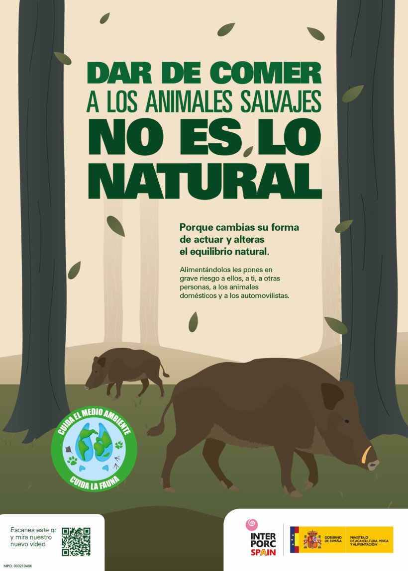 Otra de las acciones en colaboración con el Ministerio de Agricultura, Pesca y Alimentación (MAPA) ha sido la campaña, denominada ‘Dar de comer a los animales silvestres NO es lo natural’, dirigida a los ciudadanos para recordarles la importancia de no alimentar por su cuenta a estos animales, para lo que se han realizado dípticos, posters, infografías y vídeos dirigidos a los senderistas, visitantes de parques naturales o vecinos de zonas con superpoblación de jabalíes.