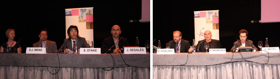 Foto izquierda: Sesión de virus emergentes. De izquierda a derecha: T. Kekarainen, XJ. Meng, S. Otake y J. Segalés. Foto derecha: Sesión de PRRS. De izquierda a derecha: R. Rowland, H. Nauwynck y E. Mateu.