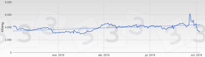 Średnia cena w Korei Południowej w ubiegłym roku wyniosła 4 357 KRW / kg (3,36 € / kg; 3,96 USD / kg) i jest jak dotąd wyższa niż średnia w 2019 r., tj. 3 994 KRW / kg (3,05 € / kg: 3,42 USD / kg), chociaż musimy podkreślić silny wzrost w połowie września, kiedy osiągnięto 6,201 KRW / kg (4,07 EUR / kg; 5,21 USD / kg), wzrost ten zbiega się z potwierdzeniem pierwszych ognisk ASF w kraju.