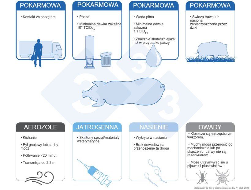 Najważniejszymi drogami przenoszenia wirusa afrykańskiego pomoru świń (ASFV) są drogi pokarmowe, głównie poprzez spożycie paszy i/lub kontakt ze sprzętami/przedmiotami zanieczyszczonymi cząstkami wirusa. Trwałość wirusa, jak również trudności w jego inaktywacji (Tabela 1) przyczyniają się do tego, że jest on trudny do zwalczenia.