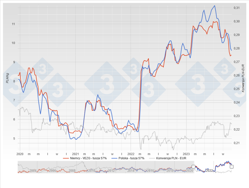 Rozpoczęliśmy listopad. Przez ostatni miesiąc cena zgodnie z oczekiwaniami spadła, co wynikało nie tylko ze spadków na giełdzie niemieckiej, ale i umocnienia się złotówki względem euro. W ostatnim tygodniu października płacono w Polsce już poniżej 10 zł za kg w klasie E – niżej aniżeli miesiąc wcześniej, ale za to więcej niż u naszych zachodnich sąsiadów. Z czego to wynika? – z dostępności zwierząt do uboju. Za Odrą nadal jest ona wyższa, aniżeli u nas, co powoduje, że zakłady gotowe są więcej płacić za towar, ponieważ i tak jest problem z jego importem, gdyż problem pogłowia to nie tylko problem Polski, ale i wielu innych krajów Europy Zachodniej.