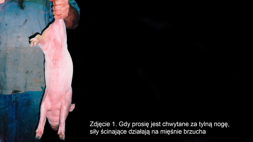 Podczas podnoszenia prosiąt, gdy może być konieczne złapanie za tylne nogi, zwierzęta należy zawsze podtrzymywać drugą ręką pod klatką piersiową lub brzuchem. W żadnym wypadku nie można skręcać nogi ani podciągać prosiąt za jedną nogę.