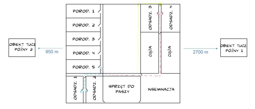 • Strzałki w różnych kolorach mogą wskazywać przepływ prosiąt, macior, warchlaków itp.