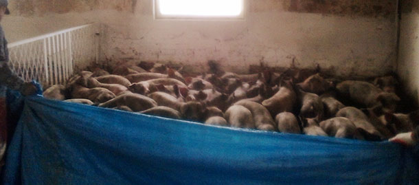 Używanie plandeki do stłaczania świń w jednym miejscu