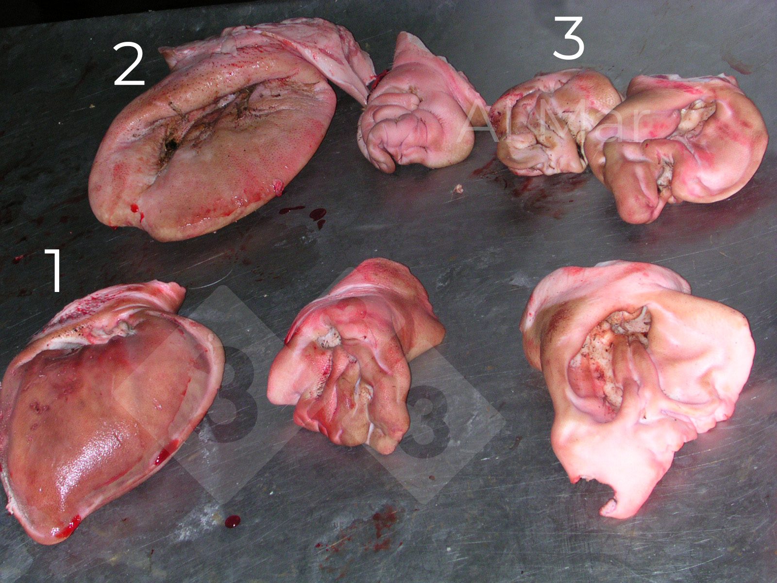 Obraz przedstawia krwiaka na różnych etapach : pierwszy przedstawia ucho z krwistą cieczą w przestrzeni między skórą a chrząstką (1); drugi przedstawia tę samą przestrzeń wypełnioną twardą tkanką włóknistą (2); i trzeci obraz przedstawia końcowe gojenie się skóry i chrząstki, co prowadzi do zniekształcenia ucha (3).