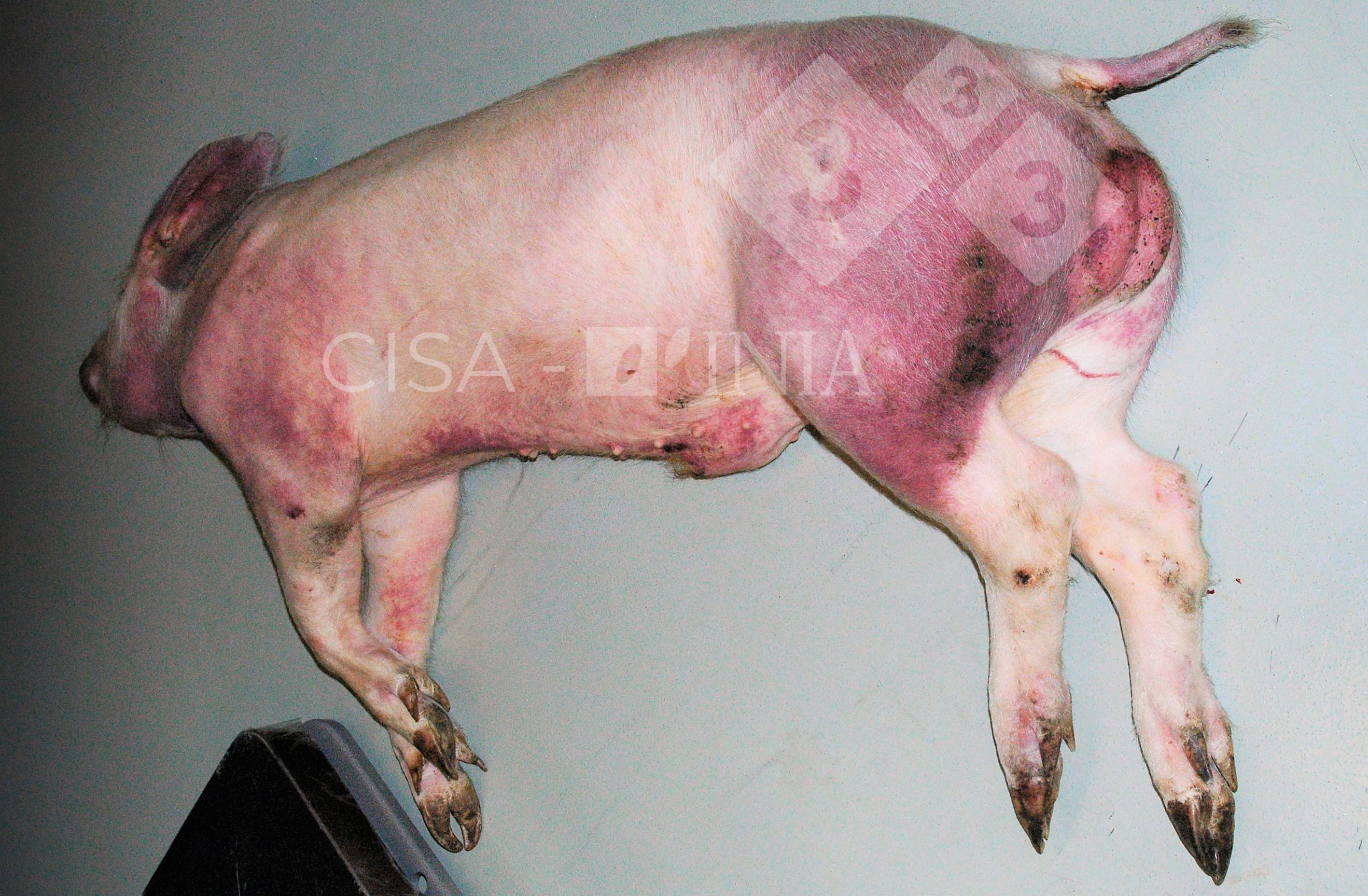 Zwierzę było zakażone ASF. Na ciele widoczne są rozległe obszary przekrwienia. Chore świnie były osłabione, ospałe i miał mały apetyt. Tego rodzaju zmiany mogą być mylone z wieloma innymi chorobami, takimi jak klasyczny pomór świń, PDNS lub salmonelloza.
