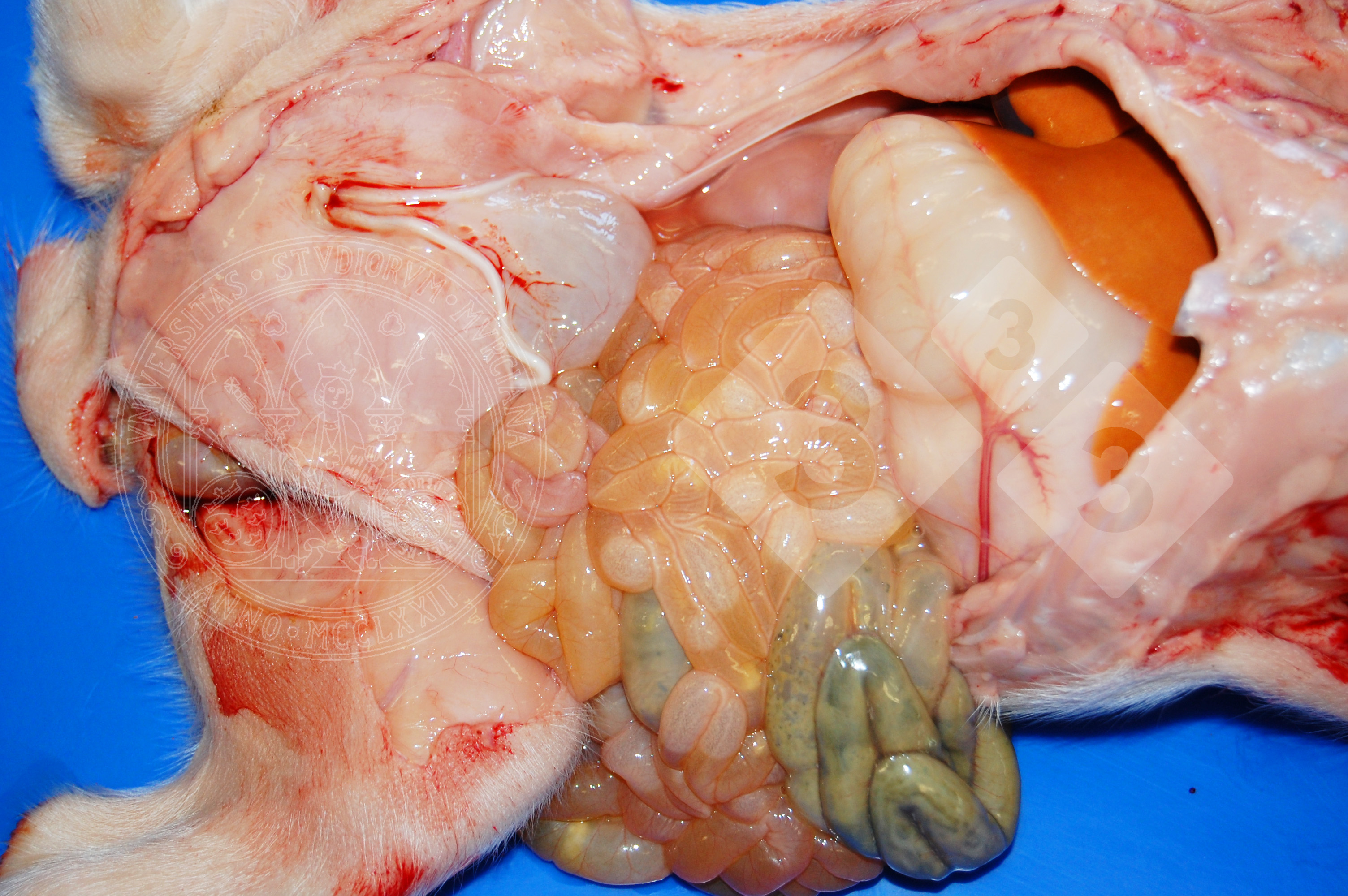 Jest to zdjęcie jelita cienkiego prosięcia ssącego, u którego wystąpiła biegunka. Ściana jelita jest wiotka, bardzo cienka i ma wodnistą zawartość. Mikroskopowo widać atrofię i fuzję kosmków oraz wakuolizację wierzchołkowych enterocytów. Ta zmiana jest charakterystyczna dla zakażenia wirusami jelitowymi, takimi jak rotawirus i koronawirus. Rozpoznanie to zanikowe nieżytowe zapalenie jelit.