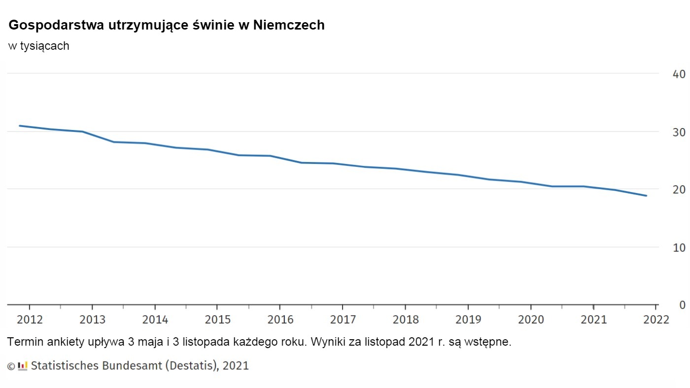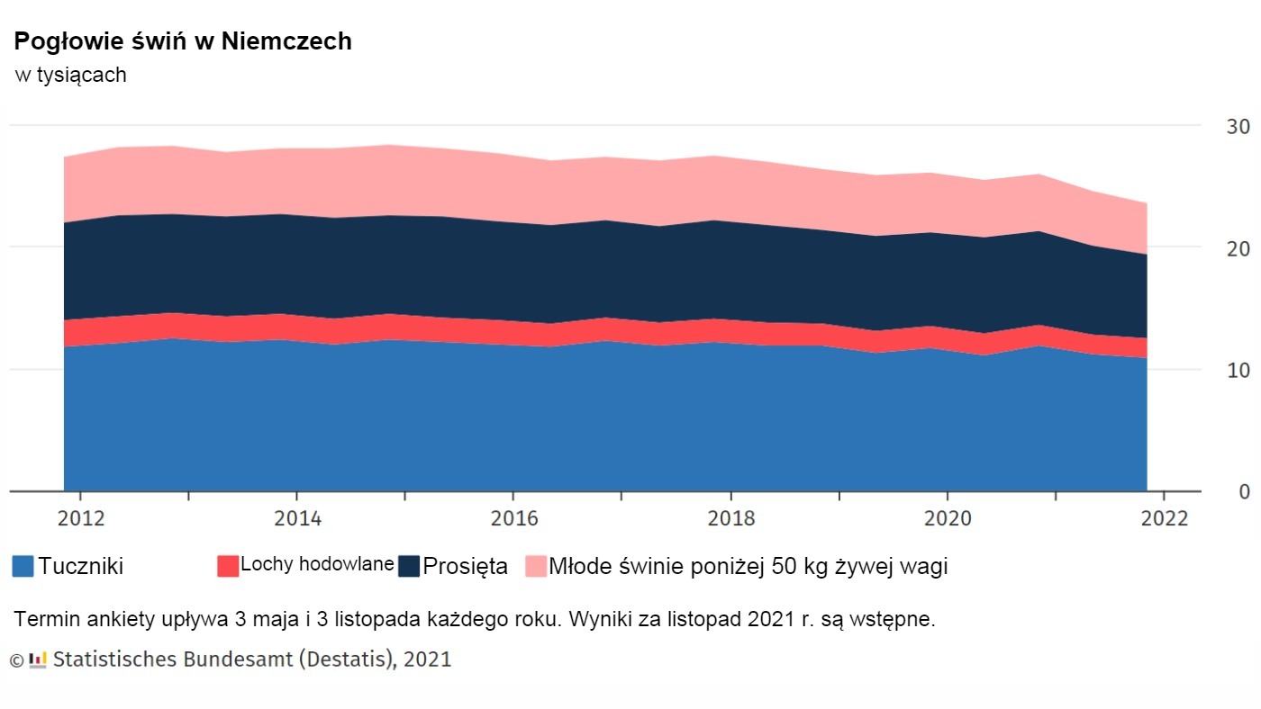 Według wstępnych wyników na dzień 3 listopada 2021 r. w Niemczech trzymano 23,6 mln świń. Jak donosi Federalny Urząd Statystyczny (Destatis), była to najniższa populacja świń od 1996 roku. W porównaniu z badaniem pogłowia z 3 maja 2021 r., liczba świń spadła o 4,4%, czyli o 1 081 000 sztuk. W porównaniu z rokiem poprzednim z 3 listopada 2020 r. liczba ta spadła o 9,4%, czyli 2 450 300 zwierząt.