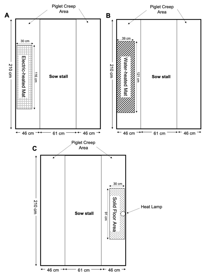 Badanie to porównywało maty ogrzewane wodą i maty ogrzewane elektrycznie z lampami grzewczymi jako dodatkowe źródła ciepła dla prosiąt ssących. Czterdzieści dwa mioty były badane w 3 próbach. We wszystkich próbach, zachowanie prosiąt było rejestrowane na wideo w dniu 1, 3, 7, 14 i 21 po porodzie. Filmy były skanowane w celu rejestracji postawy (leżące i stojące) i lokalizacji (na lub z dala od maty), aby ocenić wykorzystanie źródeł ciepła przez prosięta. Rejestrowano wielkość miotu i waga przy urodzeniu i odsadzeniu oraz śmiertelność przed odsadzeniem. Dane analizowano przy użyciu procedur Glimmix w SAS.