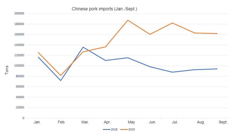 Dane dotyczące chińskiego importu wieprzowiny w ciągu pierwszych dziewięciu miesięcy tego roku pokazują wzrost o 43,62% w porównaniu z analogicznym okresem ubiegłego roku, osiągając 1 325 700 ton (923,053 ton między styczniem a wrześniem 2018 r.).