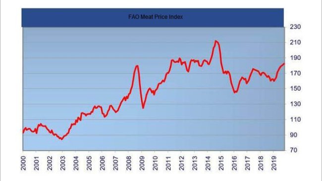 Indeks cen mięsa FAO wzrósł o 4,6 procent, co jest największym wzrostem miesiąc do miesiąca od ponad dekady.