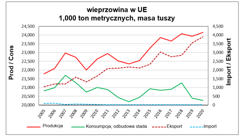 Podczas gdy produkcja wieprzowiny w UE rośnie, konsumpcja unijna maleje o około 20,8 mmt CWE. Konsumpcja nieznacznie spada w większości krajów, najbardziej w Niemczech. Prognozuje się, że całkowita konsumpcja krajowa spadnie do około 20,3 mmt CWE w 2020 r., pozostawiając 3,9 mmt CWE dostępnego na eksport. Oczekuje się, że w 2020 r. 16,1 procent produkcji krajowej zostanie wyeksportowane do krajów trzecich. Nic dziwnego, że Chiny będą głównym celem eksporterów wieprzowiny w UE.