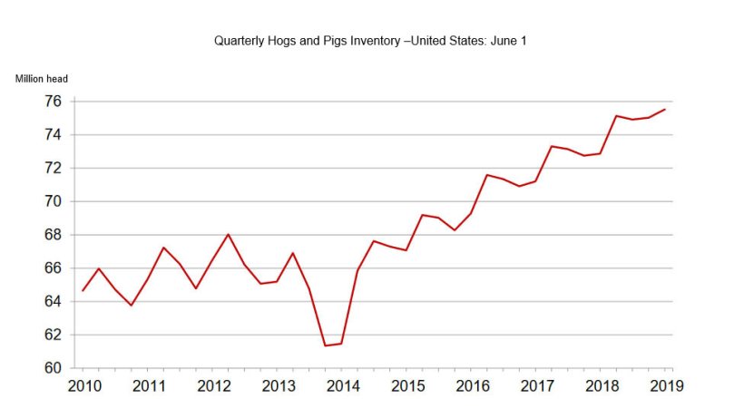 Od 1 czerwca w gospodarstwach amerykańskich było 75,5 miliona świń, o 4 procent więcej niż w czerwcu 2018 r. i o 1 procent od 1 marca 2019 r., Według raportu Quarterly Hogs and Pigs opublikowanego przez U.S. Department of Agriculture’s National Agricultural Statistics Service (NASS). Jest to najwyższe pogłowie wszystkich świń wszech czasów, a szacunki rozpoczęto w 1964 roku.