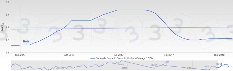 A cotação dos porcos subiu 0,003€/kg em Portugal na primeira quinzena de Janeiro, o que é o mesmo que ter mantido. Com os feriados de dia de Natal e dia de Ano Novo, houve redução nos abates com a consequente subida dos pesos. Normalmente este problema vai-se resolvendo ao longo do mês de Janeiro, apesar de o primeiro mês do ano ser sempre um mês fraco de venda de carne, criando algumas condições para a estabilidade.