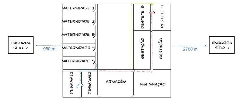 • Indicar o fluxo de leitões, porcas, desmamadas, etc., com setas de cores diferentes