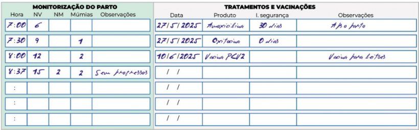 O verso da folha é utilizado para registar a evolução do trabalho de parto. Anotações exactas ajudam a saber se é necessária uma intervenção no parto. O tratador, vendo que a porca não pariu nenhum leitão em 30 minutos e avaliando o seu historial de nados-mortos, decide assistir ao parto.