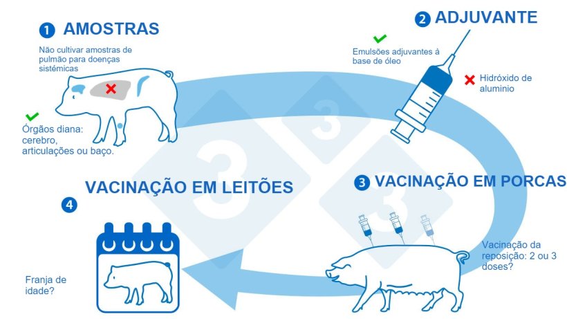 4. Vacinação dos leitões: demasiado pronto ou demasiado tarde. Até onde sabemos, apenas três artigos publicados abordaram a eficácia deste foco preventivo em condições de campo. Numa exploração de ciclo fechado, os leitões receberam uma vacina autógena no desmame e um reforço 3 semanas depois de entrar na transição. O efeito directo da vacinação (mortalidade por S. suis) não foi estatisticamente significativo. No entanto, a eficácia calculada total e geral da vacina (mortalidade completa a nível de exploração) mostrou de alguma maneira efeitos protectores potenciais. No entanto, aqui foi considerada a mortalidade devida a qualquer causa (Hopkins et al, 2019). Num estudo de campo onde são vacinados os leitões no desmame e revacinados 10 dias depois, as taxas de mortalidade e morbilidade nos leitões desmamados flutuaram independentemente do tratamento (Torremorell et al, 1997), o que confirma a dificuldade de avaliar o resultado clínico da vacinação e a importância de um diagnóstico adequado. Finalmente, no terceiro estudo, os leitões receberam uma vacina autógena durante a primeira semana de vida e às três semanas de idade. Este programa de vacinação não conseguiu induzir uma resposta de anticorpos e não foi observada nenhuma protecção clínica. A falta de resposta pode dever-se à interferência de um alto nível de anticorpos maternos e/ou a um sistema imunitário imaturo dos leitões. Portanto, é necessária mais investigação para avaliar a franja de idade perfeita para a vacinação dos leitões com a finalidade de evitar a interferência materna mas conferir protecção no momento do aparecimento dos sinais clínicos de S. suis.