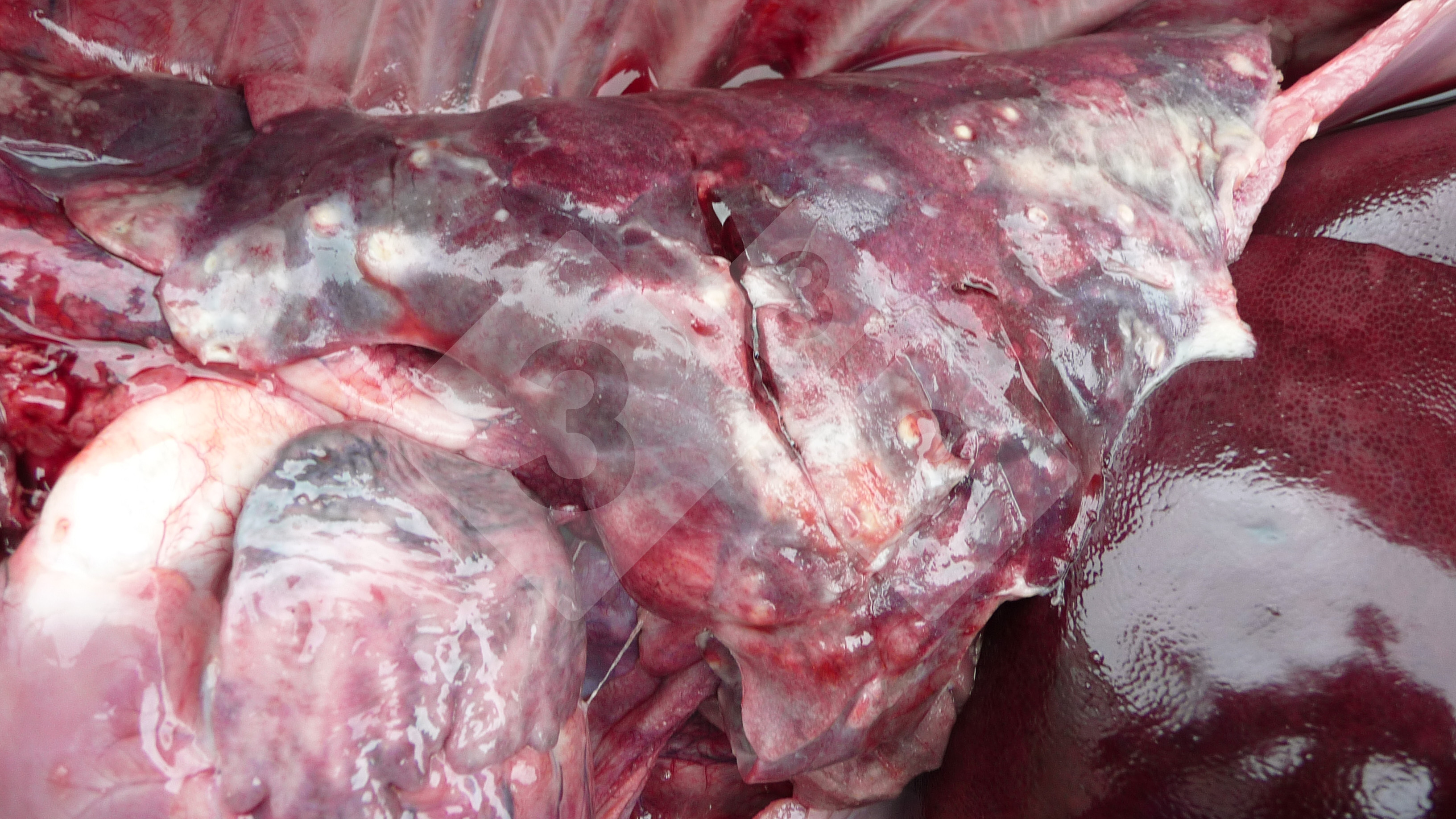 Neste pulmão isolou-se Trueperella pyogenes. Trata-se de um patogénico oportunista causador de infecções purulentas (abcessos) em diferentes partes do corpo. Este porco tinha sofrido mordeduras de cauda, mas a lesão já se tinha curado quando o animal morreu.