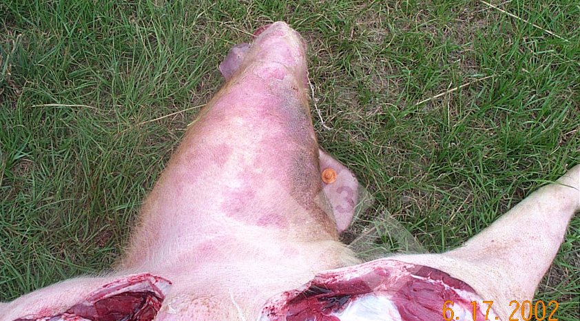 Esta lesão é a apresentação típica em porcos de uma antiga doença animal conhecida como antraz, causada pelas bactérias de grande tamanho Bacillus anthracis. Os porcos afectados costumam ser animais adultos que vivem no exterior, que se apresentam apáticos, não comem e têm uma inflamação dura, quente e dolorosa na parte ventral do pescoço e na parte inferior da cara. Na necrópsia observa-se um fluido gelatinoso e duro no edema do pescoço e da garganta, com uma infiltração extensiva no tecido do pescoço e mandíbulas com um fluido sanguinolento claro, de aspecto cor de vinho e material gelatinoso. O gânglios linfáticos locais estão muito entumescidos e edemaciados, enquanto que os órgãos internos, incluindo o fígado e o baço, aparecem relativamente normais. É importante confirmar qualquer morte suspeita mediante tinção e exame de esfregaços secos dos gânglios linfáticos e dos fluidos escuros do pescoço. Este diagnóstico de esfregaço costuma ser difícil em porcos, pelo que também seja importante realizar culturas de gânglios linfáticos. As bactérias produtoras de antrax encontram-se no solo apenas em regiões endémicas concretas pelo que, a menos que se criem porcos nessa zonas, seja uma doença rara. Contudo, quando a doença ocorre, costuma ser dramático, devido ao medo que o antrax provoca nos seres humanos. Com frequência é difícil fazer o maneio dos porcos afectados de uma forma prática e, em geral, devem ser destruídos no próprio local por incineração.