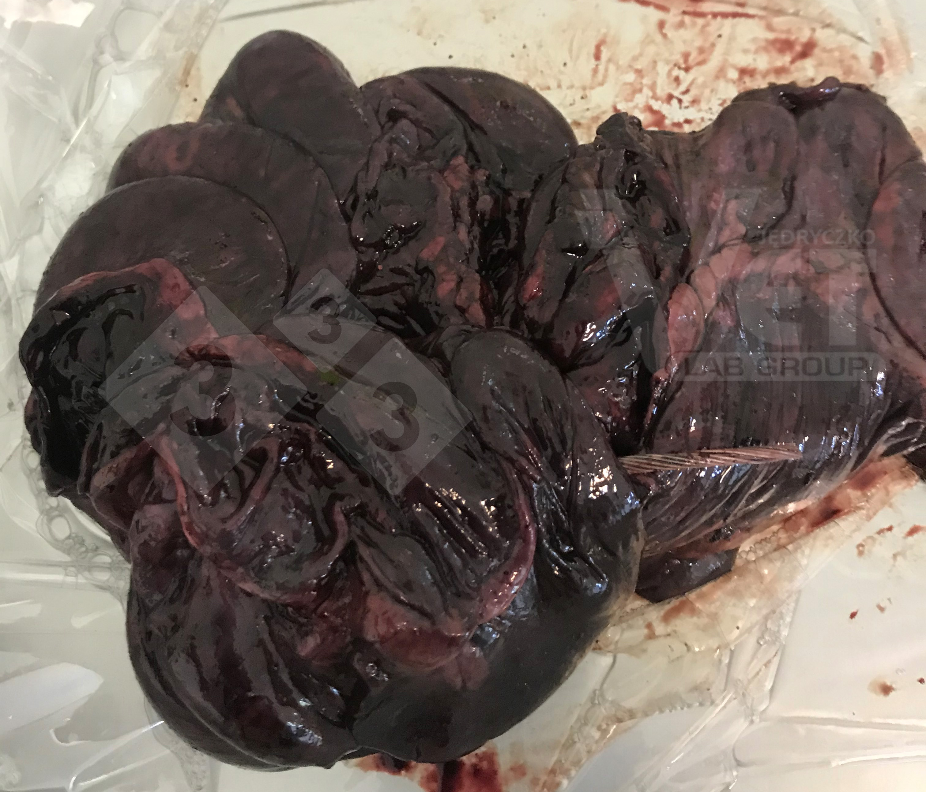 Estas alterações inflamatórias no intestino de um porco de engorda foram provocadas por Lawsonia intracellularis. As alterações mais típicas começam no íleo, de seguida no jejuno, cego e cólon. As secções intestinais alteradas estão dilatadas e distendidas, a sub-mucosa está inflamada, por vezes com petéquias. Dentro dos intestinos, podem-se encontrar coágulos de fibrina ou sangue fresco. Neste caso grave com notórias alterações hemorrágicas, realizou-se o diagnóstico por PCR para a detecção de Lawsonia intracellularis. A PCR para a detecção de Brachyspira hyodysenteriae foi negativa.