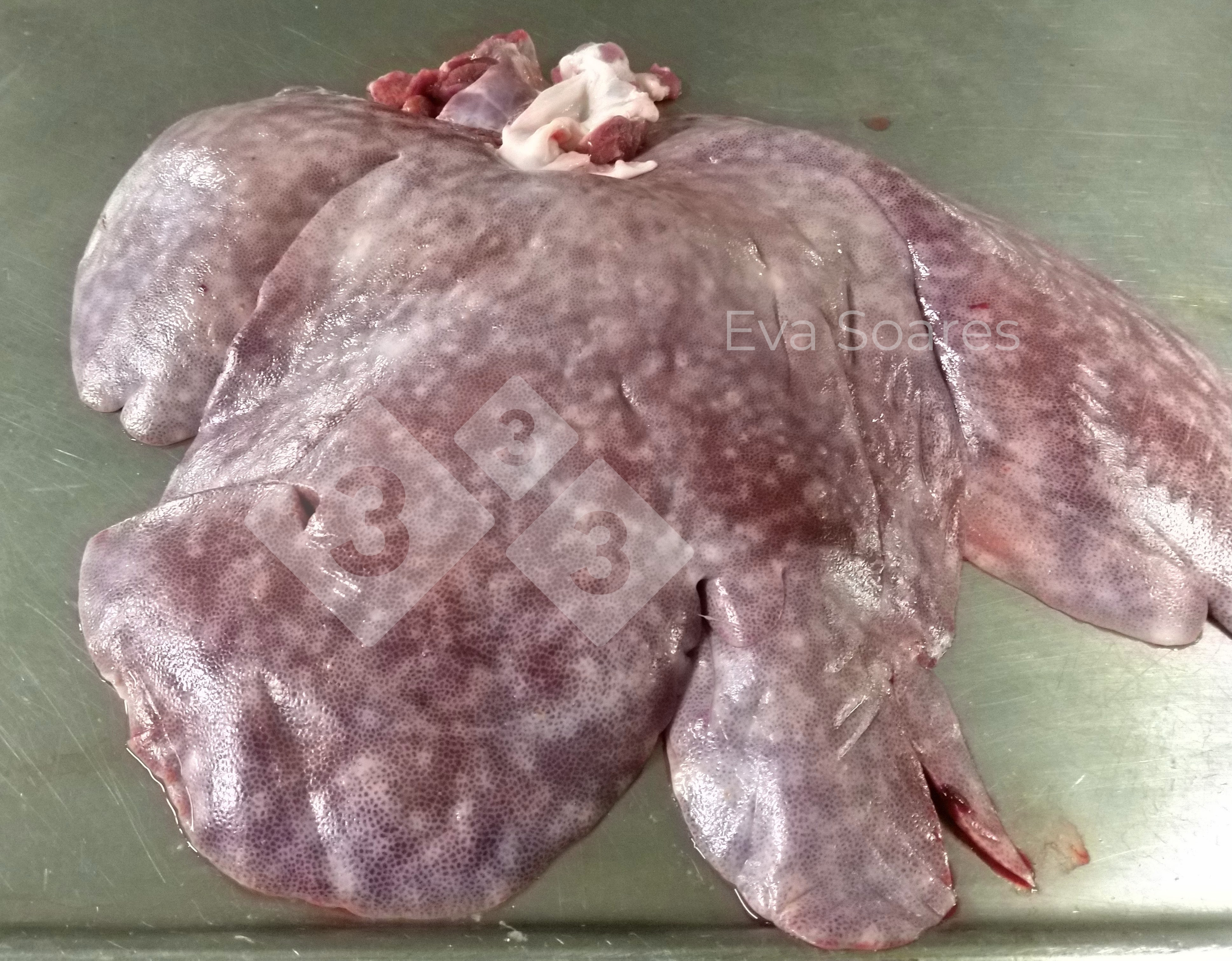 Lesões encontradas num porco de engorda no matadouro. Estas lesões, também conhecidas por “manchas leitosas”, resultam da migração de larvas de Ascaris suum que, por acção irritativa, dão origem a focos de hepatite intersticial crónica. Inicialmente estas lesões são hemorrágicas, mais tarde tornam-se bem definidas e de cor branca, aparecendo tanto no interior como à superfície do fígado.