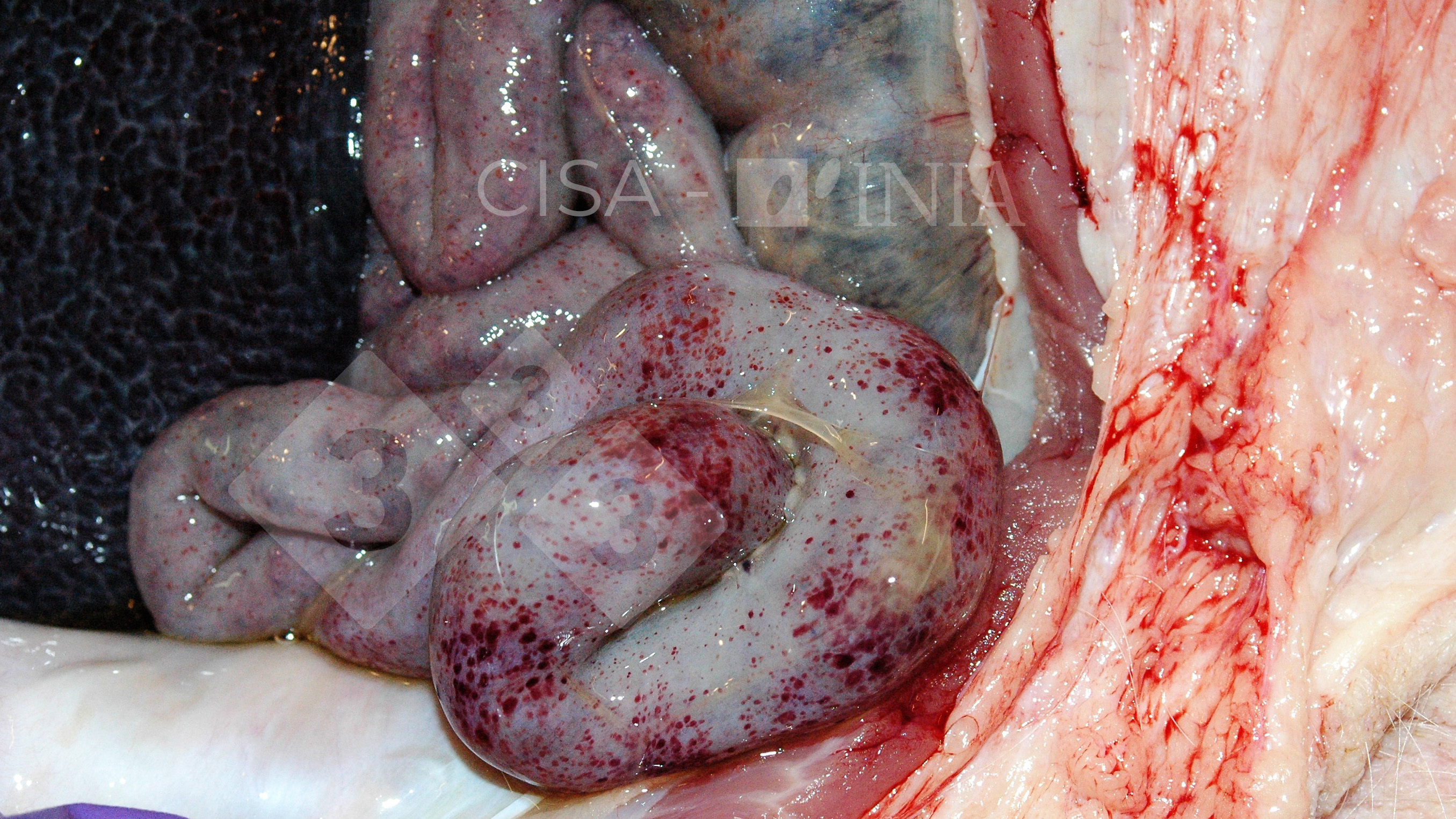 Intestino delgado com hemorragias petequiais na serosa e na mucosa. Trata-se de um quadro agudo de Peste Suína Africana observado 2 dias após a infecção experimental. O animal apresentou febre alta (> 41 Cº) anorexia e prostração.