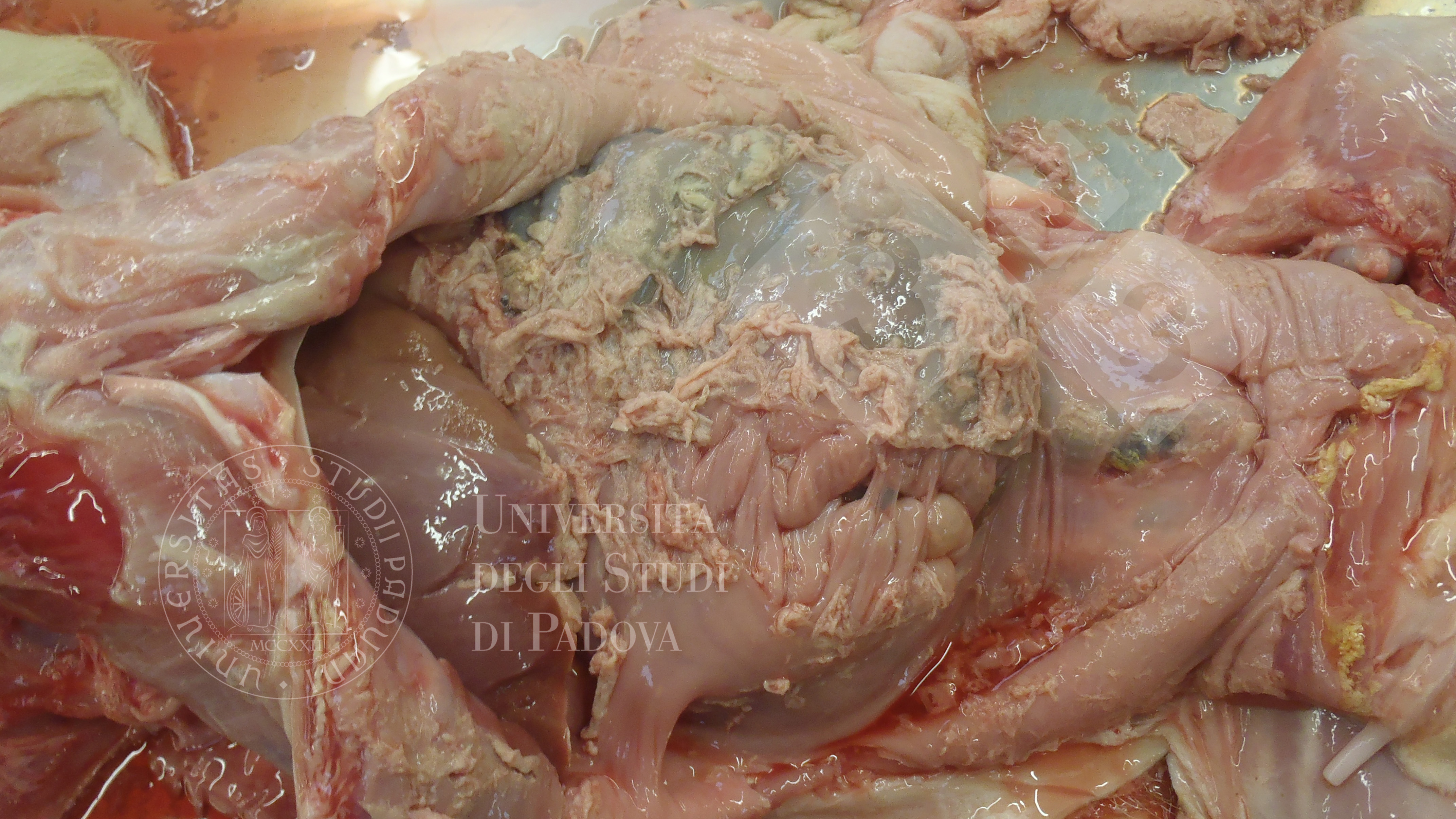 Os órgãos peritoneais estão cobertos por um exsudado fibrinoso amarelado, difuso, severo e bem organizado. Esta peritonite crónica, severa e difusa apenas se pode ver no abdómen ou noutras cavidades serosas (pericárdio e pleura). Estas sintomas são consistentes com a Doença de Glässer (poliserosite) provocada por Haemophylus parasuis. Esta doença, ocasionalmente, também pode afectar as articulações e o sistema nervoso central.