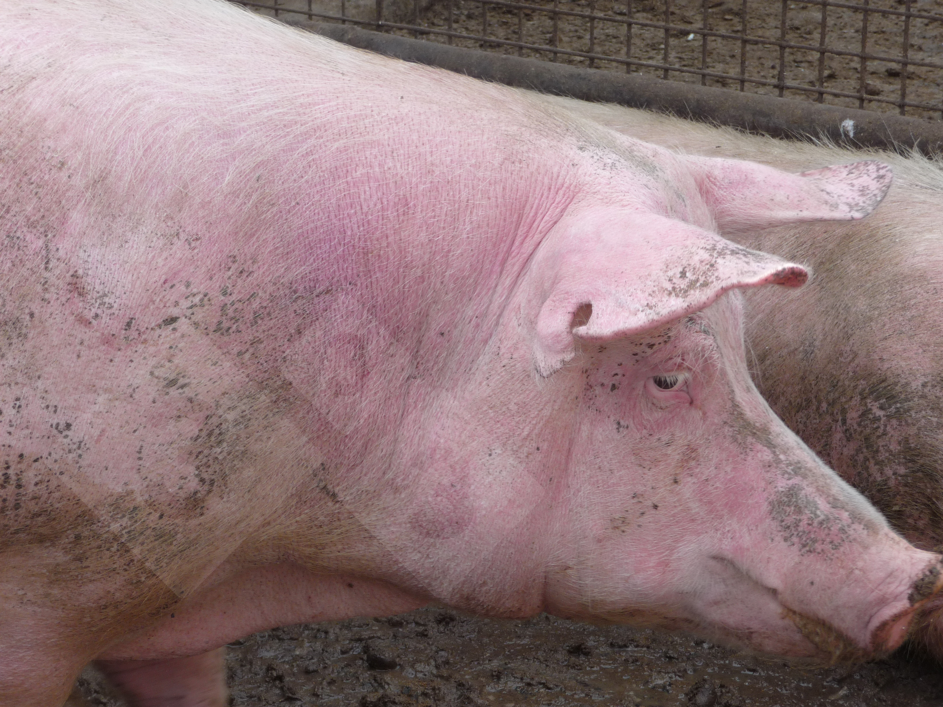 Esta porca foi deixada ao ar livre sem sombra para se poder proteger do sol. As partes brancas do corpo estão vermelhas, edematosas e irritadas e os animais parecem ter dor.