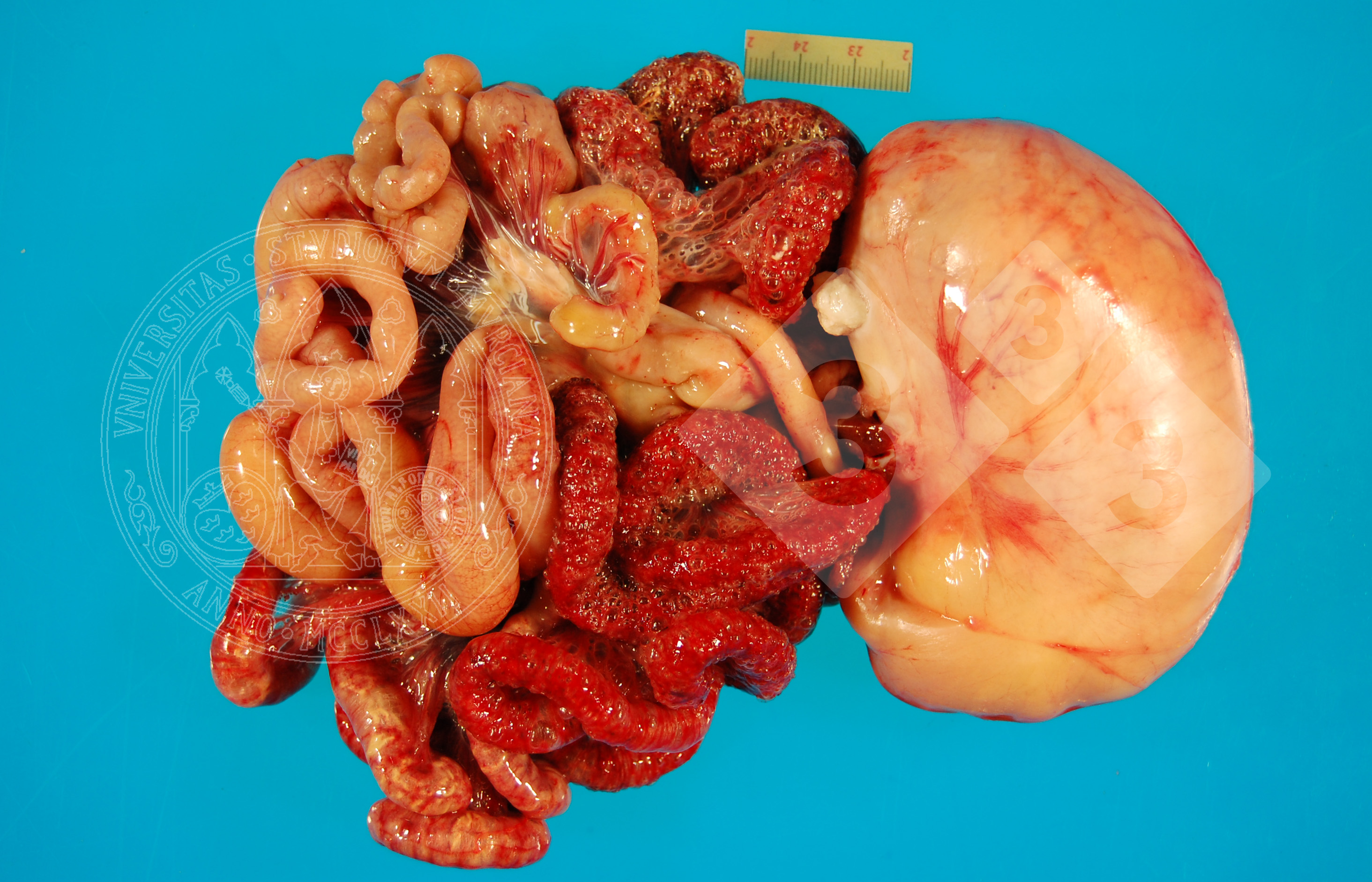 Este intestino é de um leitão lactante. Observam-se partes do intestino com a serosa com cor encarnada intensa com numerosas bolhas de gás que alternam com outros segmentos de cor amarelada.