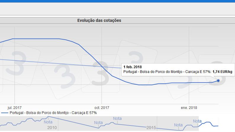 Em Portugal a cotação dos porcos, na Bolsa do Porco, subiu 0,07€/kg carcaça na primeira quinzena de Fevereiro