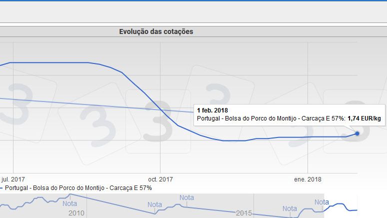 A cotação dos porcos subiu 0,003€/kg em Portugal na primeira quinzena de Janeiro, o que é o mesmo que ter mantido.