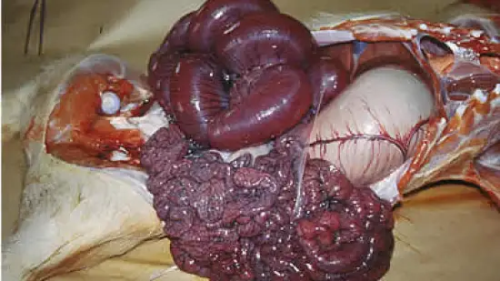 Estas lesões no intestino delgado de um leitão de 10 dias morto devem-se a: