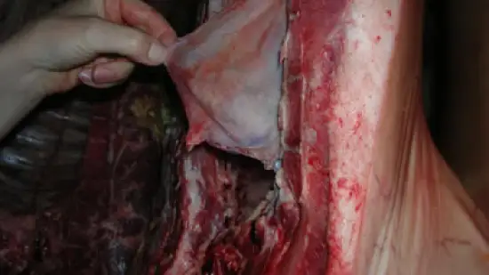 Este porco foi rejeitado devido a uma pericardite. Na tua opinião, que se deveria ver numa carcaça normal após a evisceração?