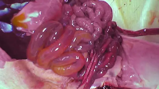 Qual poderá ser a origem desta gastrite num leitão de 20 kg que morreu de forma súbita?