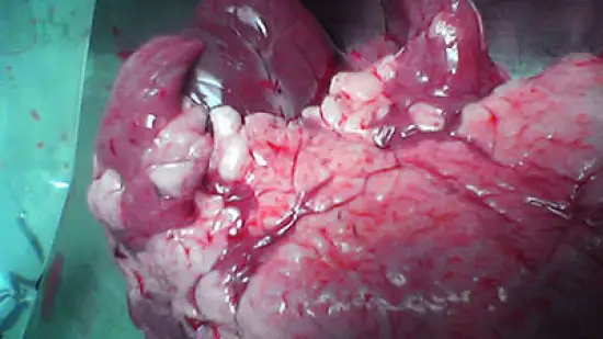 Estas lesões pulmonares moderadas num porco com importante perda de peso no início da engorda fazem pensar na presença de: