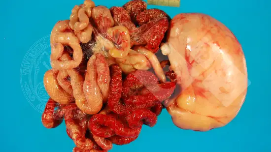 Há diarreia sanguinolenta e mortalidade em leitões de 3 dias de vida. O intestino delgado dos leitões pós-mortem tem cor vermelho escuro, hemorrágico e cheio de líquido sanguinolento. Qual é a causa mais provável desta lesão?