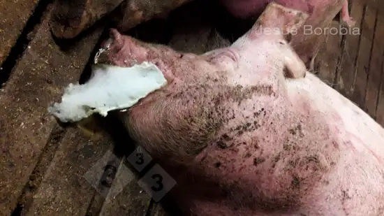 Ao cortar a carcaça a meio é encontrado um abcesso na coluna vertebral, que rebenta. Qual poderá ser a origem?