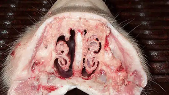Que lesão é esta encontrada ao seccionar a cavidade nasal de um porco com 10 semanas de idade?