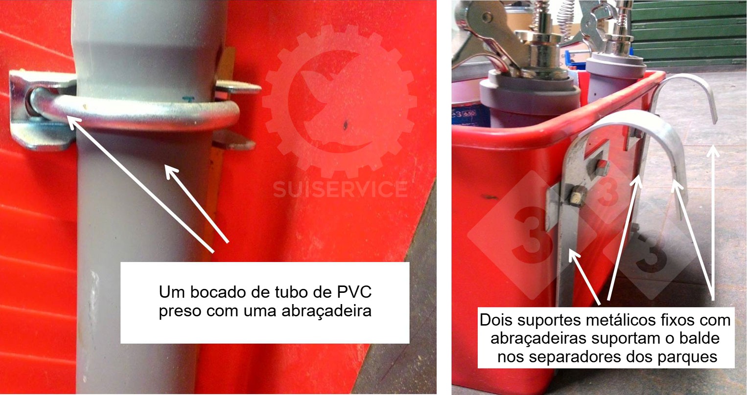 Três tubos de plástico estão presos ao balde por abraçadeiras, que irão albergar três seringas diferentes que podem ser utilizadas para diversos tratamentos antibióticos ou anti-inflamatórios. O comprimento do tubo é calculado com base no comprimento da seringa, incluindo a agulha, para que, ao ser inserida, a agulha não toque no fundo e, portanto, não seja danificada. No entanto, é sempre melhor remover a agulha após cada tratamento. Os suportes externos permitem que fique apoiada nos separadores dos parques, a uma altura confortável para utilização.