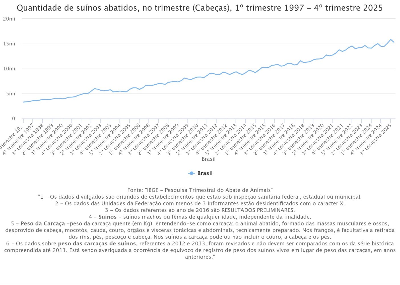 O abate de suínos no Brasil atingiu o record histórico de 60,69 milhões de cabeças em 2025, o que representa um aumento de 4,3% (+2,51 milhões de cabeças) em relação ao ano anterior. Os dados constam nos resultados completos da Pesquisa Trimestral do Abate de Animais, divulgados, no dia 18 de Março, pelo Instituto Brasileiro de Geografia e Estatística (IBGE). O resultado, o maior da série histórica iniciada em 1997, foi impulsionado pelo volume record de exportações e pela redução dos custos de produção no país ao longo do ano.