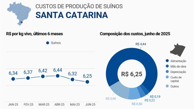 Os custos de produção de suínos caíram pelo segundo mês seguido em Junho de 2025, segundo a Embrapa Suínos e Aves (CIAS). Em Santa Catarina, o quilo do suíno vivo chegou ao menor valor do ano: R$ 6,25 (1 real vale 0,15€).
