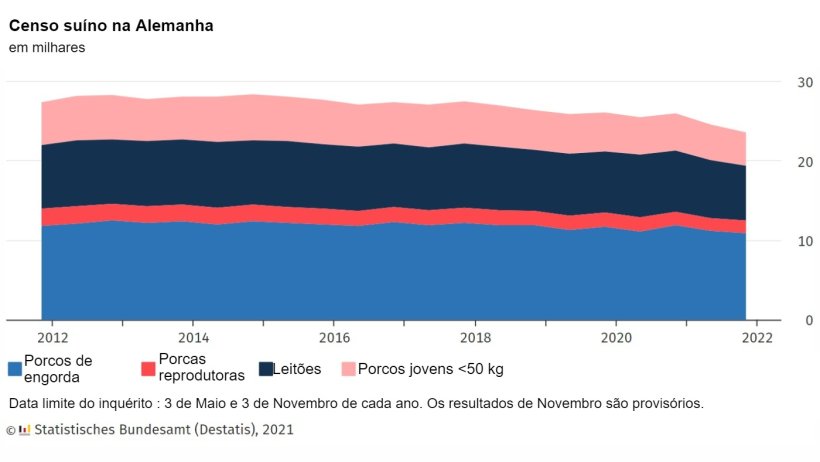 De acordo com dados preliminares do Federal Statistical Office (Destatis), a 3 de Novembro de 2021, o efectivo suíno na Alemanha era de 23,6 milhões de cabeças, o valor mais baixo registado desde 1996. Em comparação com os dados de Maio de 2021, o número de suínos foi reduzido em 4,4% ou 1.081.000 cabeças. Em comparação com Novembro de 2020, o número diminuiu 9,4% ou 2.450.300 cabeças.