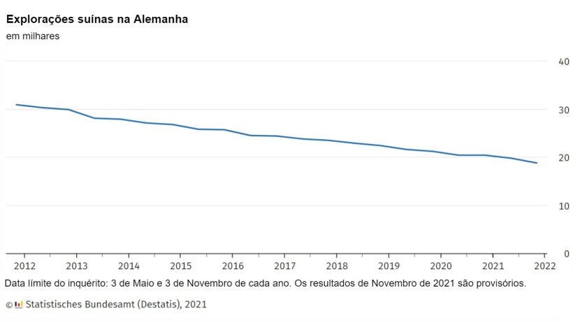 Por sua vez, o número de explorações de suínos também está a diminuir. A 3 de Novembro de 2021, havia 18.800 explorações de suínos na Alemanha, o que representa 4,6% ou 900 explorações a menos em relação a Maio de 2021. Em comparação com o ano anterior, a queda é de 7,8% (- 1.600 explorações).