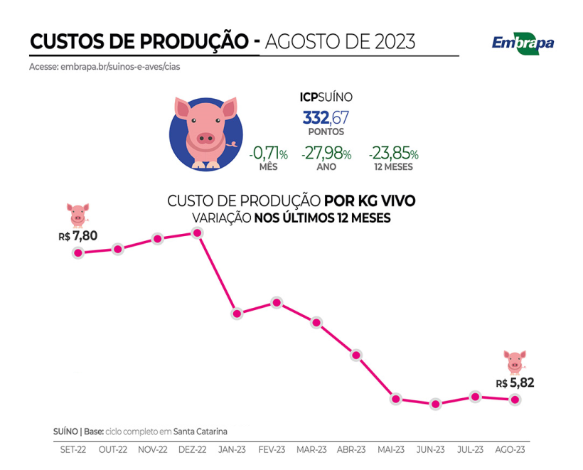 Os custos de produção de porcos tiveram redução, no mês de Agosto, segundo os estudos mensais da Central de Inteligência de Aves e Suínos (CIAS) da Embrapa Suínos e Aves. A variação do ICPSuíno foi de -0,71%, encerrando o mês de Agosto em 332,67 pontos.