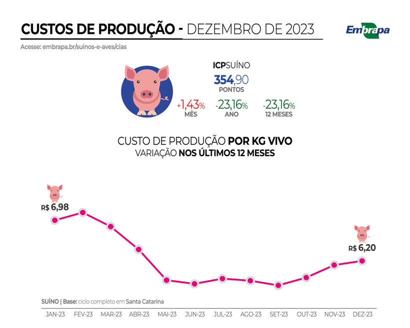 O ano de 2023 terminou com o custo de produção por quilo de peso vivo a atingir os R$ 6,20 (cerca de 1,18€/kg PV) segundo os estudos registados pela Embrapa Suínos e Aves na sua Central de Inteligência de Aves e Suínos (CIAS). Apesar do ICPSuíno registar uma subida desde Outubro (chegando a 354,90), os custos de produção baixaram no acumulado dos 12 meses do ano passado. Os dos suínos caíram 23,16% em 2023.
