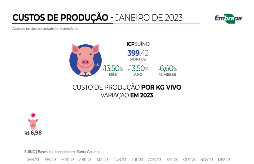 Já o custo de produção de suínos em Santa Catarina em Janeiro de 2023 foi estimado em R$ 6,98 por kg vivo, o que representa uma variação de -13,5% em relação ao mês anterior. Assim, o ICPSuíno ficou em 399,35 pontos, uma diferença de -63 pontos em relação ao mês anterior, sendo que a variação de preços elevou o índice em 14 pontos e a mudança de coeficientes técnicos reduziu o índice em 77 pontos.