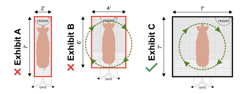 Nos termos da Proposta 12, o tipo de alojamento não pode impedir que uma porca se possa deitar, pôr-se de pé, estender completamente os membros e virar-se livremente. São necessários pelo menos 24 pés quadrados de espaço utilizável por porca. Este documento inclui exemplos visuais de instalações conformes e não conformes.