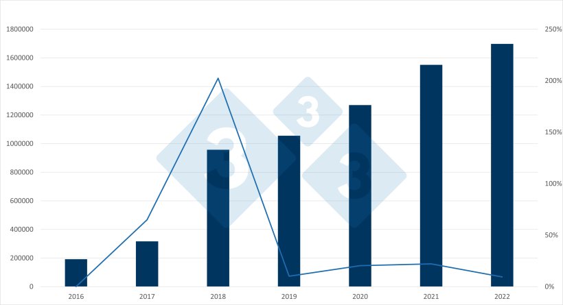 Em relação ao número de leitões neerlandeses importados em 2022, este atingiu 1697247 animais, se bem que represente um aumento de 9% em relação ao ano anterior, o ritmo de crescimento das importações foi menor do que o dos aos anteriores.