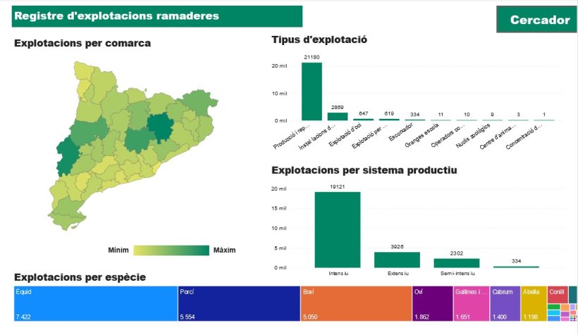A primeira imagem a aparecer é o mapa da Catalunha com as explorações totais por Concelho. Também apresenta dois gráficos de barras, um relativo ao tipo de exploração e outro relativo aos sistemas produtivos. No fim da página há um gráfico em árvore que mostra as espécies. Tanto o mapa dos concelhos como os gráficos são interactivos.