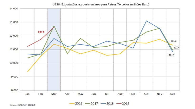 O valor mensal das exportações agro-alimentares da UE, em Março de 2019, foi igual ao nível record de Março de 2017, atingindo os 12600 milhões de euros, 7,0% acima do nível de Março de 2018. As importações em Março chegaram aos 10100 milhões de euros, +1,9% em comparação com Março de 2018. Portanto, o superávit comercial agro-alimentar mensal situou-se em 2500 milhões de euros, um aumento de mais de 34% relativamente à balança comercial positiva de 1900 milhões de euros em Março de 2018.